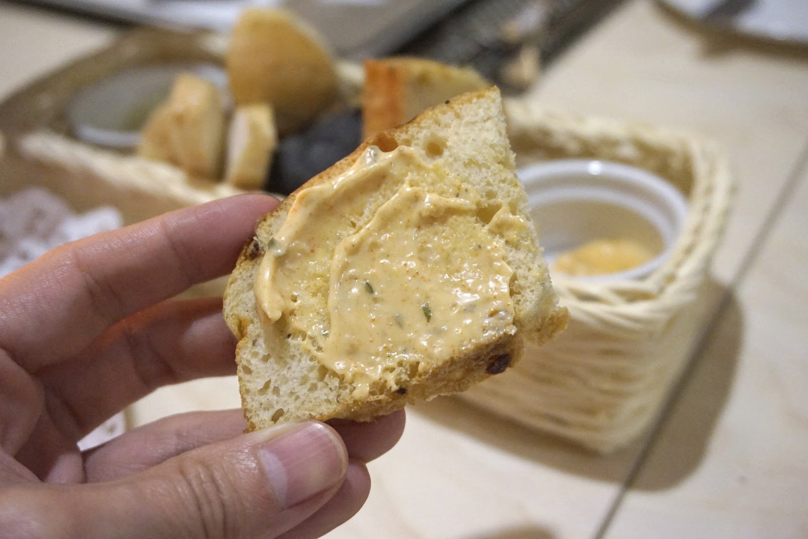 開場白講咁耐,喺時候講食,先嚟嘅麵包籃已顯出誠意,大廚表示麵包全自家製,一小籃裡一口氣有4款(近至遠):洋葱、芝麻、墨汁芝士、香草伴牛油及千島醬(唔喺撈沙律嗰啲,但味道有啲似),全自家手製,質素不俗,軟熟而各有特色。