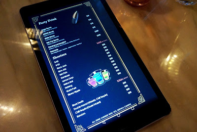 呢類餐廳始終以賣酒為主,所以,飲品都以帶酒精類嘅為多,例如:雞尾酒、香檳、紅白餐酒、白蘭地、威士忌、生啤、各種烈酒……等等,餐牌都以平版顯示,配以得意彩繪,清晰易用之餘,感覺又好睇好多。